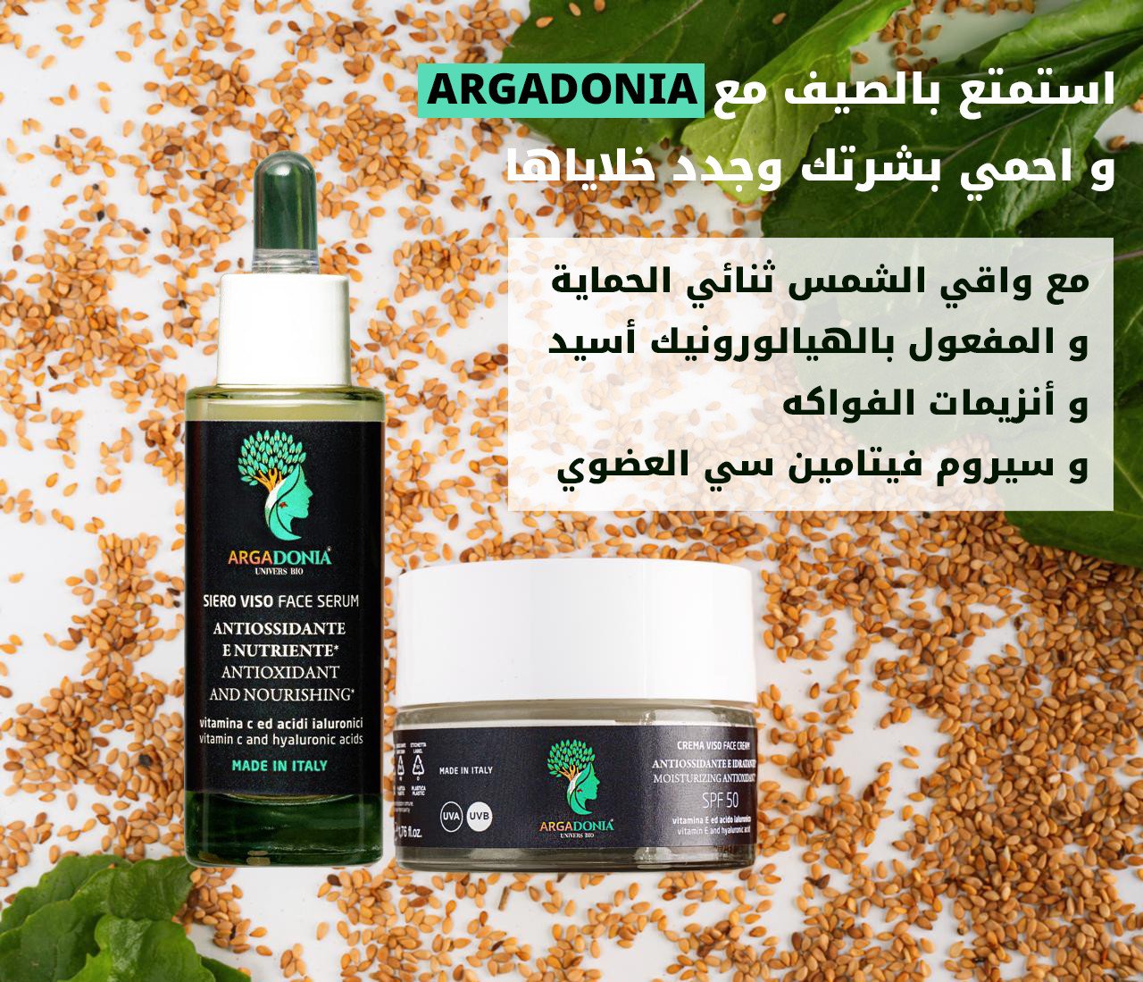 استمتع بالصيف مع Argadonia و احمي بشرتك وجدد خلاياها مع واقي الشمس ثنائي الحماية و المفعول و سيروم فيتامين سي العضوي بالهيالورونيك أسيد و أنزيمات الفواكه